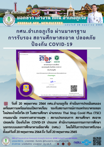 กศน.อำเภอภูเรือ ผ่านมาตรฐาน การรับรอง สถานศึกษาสะอาด ปลอดภัย ป้องกัน COVID-19