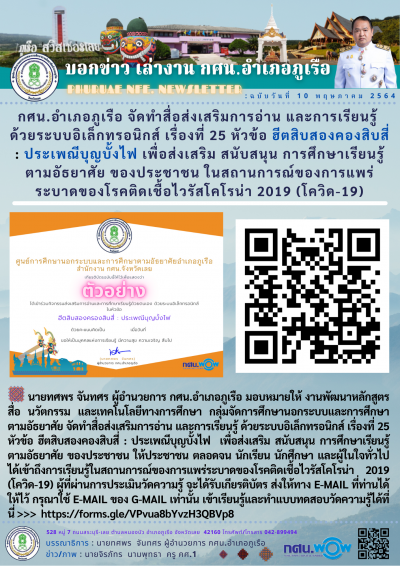 กศน.อำเภอภูเรือ จัดทำสื่อส่งเสริมการอ่าน และการเรียนรู้ ด้วยระบบอิเล็กทรอนิกส์ เรื่องที่ 25 หัวข้อ ฮีตสิบสองคองสิบสี่ : ประเพณีบุญบั้งไฟ เพื่อส่งเสริม สนับสนุน การศึกษาเรียนรู้ ตามอัธยาศัย ของประชาชน ในสถานการณ์ของการแพร่ระบาดของโรคติดเชื้อไวรัสโคโรน่า 2019