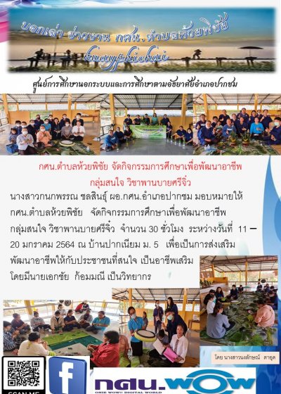กศน.ตำบลห้วยพิชัย จัดกิจกรรมการจัดการศึกษาเพื่อพัฒนาอาชีพ กลุ่มสนใจ วิชาพานบายศรีจิ๋ว