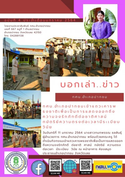 กศน.อำเภอปากชมเข้าแถวเคารพธงชาติเพื่อเป็นการแสดงออกถึงความจงรักภักดีต่อชาติศาสน์กษัตริย์ความตรงต่อเวลามีระเบียบ วินัย