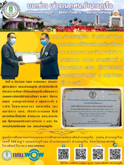 กศน.อำเภอภูเรือ เข้ารับรับเกียรติบัตรสถานศึกษาที่มีผลสัมฤทธิ์เฉลี่ยผลการทดสอบระดับชาติด้านการศึกษา N-NET ที่ผ่านเกณฑ์ มาตรฐานกำหนด 5 กลุ่มสาระทั้ง 3 ระดับ