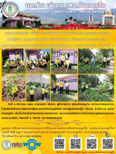 กศน.อำเภอภูเรือ จัดกิจกรรมจิตอาสาพัฒนาและปรับปรุงภูมิทัศน์บริเวณ สำนักงาน กศน.อำเภอภูเรือ เนื่องในวันคล้ายวันเฉลิมพระชนมพรรษาพระบาทสมเด็จพระปรมินทรมหาภูมิพลอดุลยเดช บรมนาถบพิตร รัชกาลที่ 9