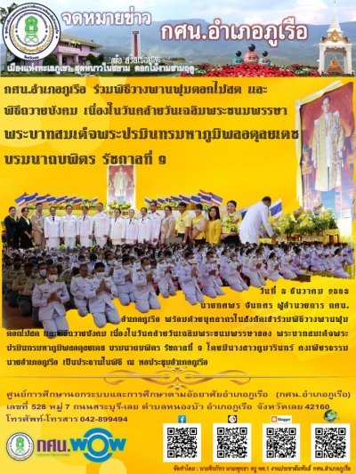 กศน.อำเภอภูเรือ ร่วมพิธีจุดเทียนมหามงคลน้อมรำลึก ในพระมหากรุณาธิคุณเนื่องในวันคล้ายวันเฉลิมพระชนมพรรษาพระบาทสมเด็จพระปรมินทรมหาภูมิพลอดุลยเดช บรมนาถบพิตร รัชกาลที่ 9