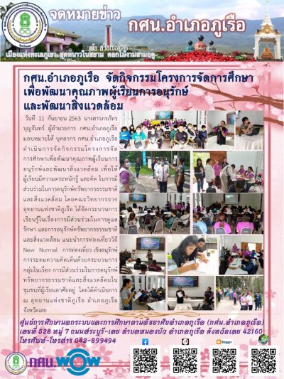 กศน.อำเภอภูเรือ จัดกิจกรรมโครงการจัดการศึกษาเพื่อพัฒนาคุณภาพผู้เรียนการอนุรักษ์และพัฒนาสิ่งแวดล้อม