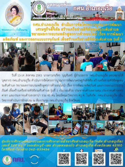กศน.อำเภอภูเรือ ดำเนินการจัดโครงการบูรณาการพัฒนาเศรษฐกิจดิจิทัล สร้างเครือข่ายดิจิทัลชุมชนระดับตำบล ขยายผลการอบรมหลักสูตรการค้าออนไลน์ เรื่อง การพัฒนา ผลิตภัณฑ์ และการออกแบบบรรจุภัณฑ์ เพื่อสร้างเครือข่ายดิจิทัลระดับตำบล รุ่นที่ 1