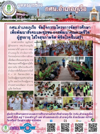 กศน.อำเภอภูเรือ จัดกิจกรรมโครงการจัดการศึกษาเพื่อพัฒนาสังคมและชุมชน การพัฒนาคุณภาพชีวิตผู้สูงอายุ ใส่ใจสุขภาพจิต พิชิตโรคซึมเศร้า