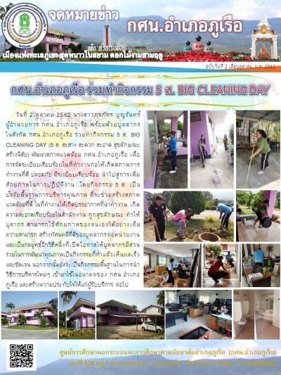 กศน.อำเภอภูเรือ ร่วมทำกิจกรรม 5 ส. BIG CLEANING DAY (5 ส. สะสาง สะดวก สะอาด สุขลักษณะ สร้างนิสัย) พัฒนาสภาพแวดล้อม กศน.อำเภอภูเรือ เพื่อการจัดระเบียบเรียบร้อยในที่ทำงานก่อให้เกิดสภาพการทำงานที่ดี ปลอดภัย มีระเบียบเรียบร้อย นำไปสู่การเพิ่มศักยภาพในการปฏิบัติงาน