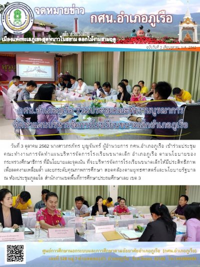 กศน.อำเภอภูเรือ เข้าร่วมประชุมคณะทำงานการจัดทำแผนบริหารจัดการโรงเรียนขนาดเล็ก อำเภอภูเรือ ตามนโยบายของกระทรวงศึกษาธิการ ที่มีนโยบายและจุดเน้น ที่จะบริหารจัดการโรงเรียนขนาดเล็กให้มีประสิทธิภาพ เพื่อลดคงามเหลื่อมล้ำ และยกระดับคุณภาพการศึกษา สอดคล้องตามยุทธศาสตร์และนโยบายรัฐบาล
