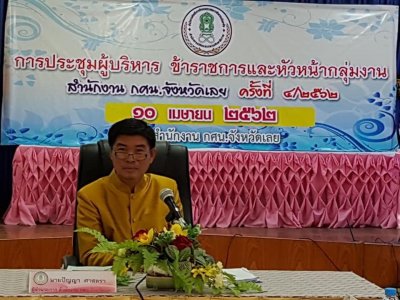 เมื่อวันที่ 10 เมษายน 2562 เวลา 09.00 น. สำนักงาน กศน.จังหวัดเลย ประชุมประจำเดือนผู้บริหาร ข้าราชการ/หัวหน้ากลุ่มงาน ครั้งที่ 4/2562 ประจำเดือน เมษายน ณ ห้องประชุมผีตาโขน ชั้น 2 สำนักงาน กศน.จังหวัดเลย โดยมี นายปัญญา ศาสตรา ผู้อำนวยการ สำนักงาน กศน.จังหวัดเลย เป็นประธานการประชุม ซึ่งมีคณะผู้บริหาร กศน.อำเภอ 14 แห่ง และเจ้าหน้าที่ บุคลากร เข้าร่วมประชุมกันอย่างพร้อมเพรียง