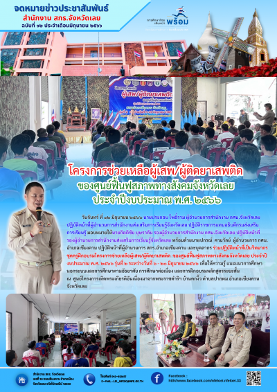 โครงการช่วยเหลือผู้เสพ/ผู้ติดยาเสพติด ของศูนย์ฟื้นฟูสภาพทางสังคมจังหวัดเลย ประจำปี งบประมาณ พ.ศ. ๒๕๖๖ รุ่นที่ ๒ ระหว่างวันที่ ๖ - ๒๐ มิถุนายน ๒๕๖๖