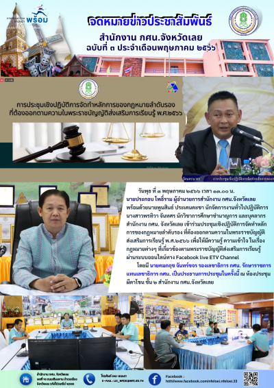 ประชุมประจำเดือนผู้บริหาร ข้าราชการและบุคลากร สำนักงาน กศน.จังหวัดเลย ครั้งที่ ๓/๒๕๖๖ ประจำเดือน พฤษภาคม ๒๕๖๖