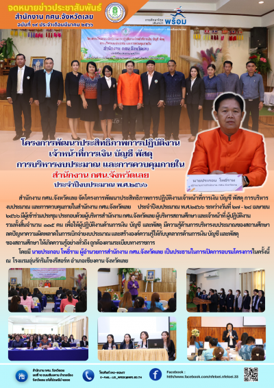 โครงการพัฒนาประสิทธิภาพการปฏิบัติงานเจ้าหน้าที่การเงิน บัญชี พัสดุการบริหารงบประมาณ และการควบคุมภายในสำนักงาน กศน.จังหวัดเลย ประจำปีงบประมาณ พ.ศ.๒๕๖๖