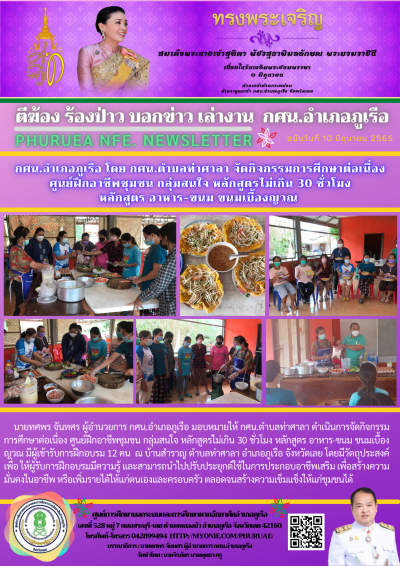 กศน.อำเภอภูเรือ โดย กศน.ตำบลท่าศาลา จัดกิจกรรมการศึกษาต่อเนื่อง ศูนย์ฝึกอาชีพชุมชน กลุ่มสนใจ หลักสูตรไม่เกิน 30 ชั่วโมง หลักสูตร อาหาร-ขนม ขนมเบื้องญวณ
