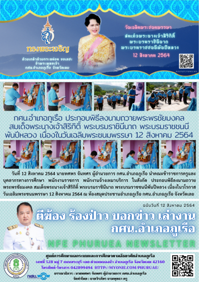 กศน.อำเภอภูเรือ ประกอบพิธีลงนามถวายพระพรชัยมงคล สมเด็จพระนางเจ้าสิริกิติ์ พระบรมราชินีนาถ พระบรมราชชนนีพันปีหลวง เนื่องในวันเฉลิมพระชนมพรรษา 12 สิงหาคม 2564