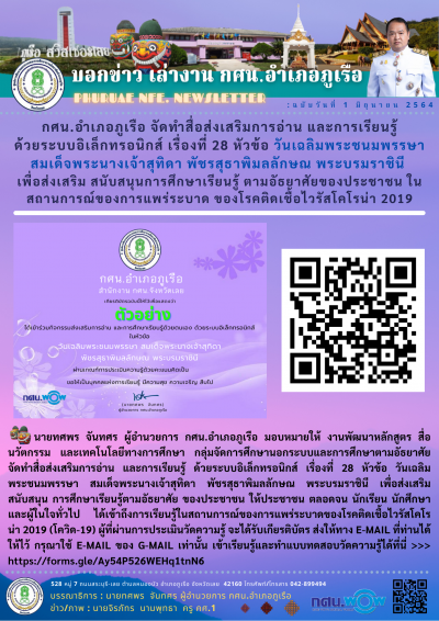 หัวข้อข่าว : กศน.อำเภอภูเรือ จัดทำสื่อส่งเสริมการอ่าน และการเรียนรู้ ด้วยระบบอิเล็กทรอนิกส์ เรื่องที่ 28 หัวข้อ วันเฉลิมพระชนมพรรษา สมเด็จพระนางเจ้าสุทิดา พัชรสุธาพิมลลักษณ พระบรมราชินี เพื่อส่งเสริม สนับสนุนการศึกษาเรียนรู้ ตามอัธยาศัยของประชาชน ในสถานการณ์ของการแพร่ระบาดของโรคโควิด-19
